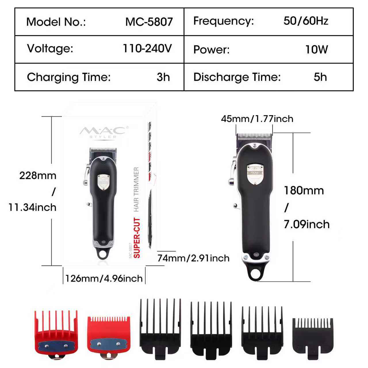 Accessories:4 attachment combs 3mm/6mm,9mm/12mm ,DC adapter, cleaning brush,oil bottle,power adaptor |