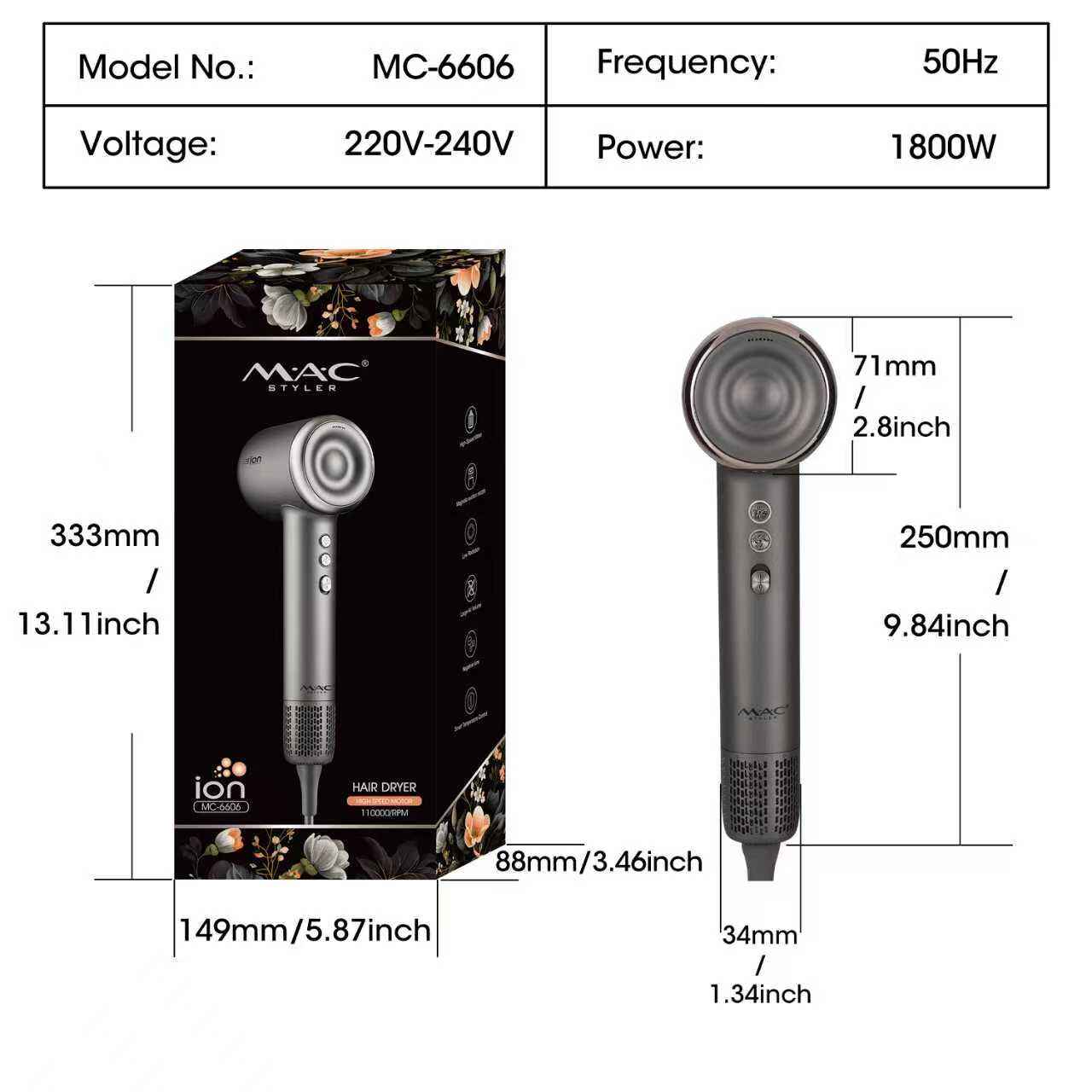 Designed for versatility, the dryer features 3 adjustable speed levels (Low/Medium/High) and 3 temperature settings (Cool/Warm/Hot), allowing you to tailor the airflow and heat to your hair type and styling goal: